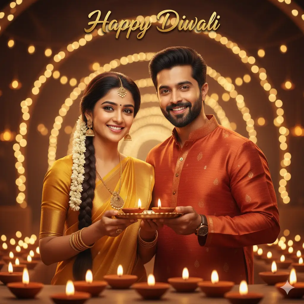 Create an ultra-realistic 8K cinematic portrait of a smiling Indian couple (same facial features from the reference images) in a medium-close, centrally framed shot, holding a small ornate plate with two lit diyas together. The woman wears a radiant golden-yellow saree with a delicate golden border, her dark hair styled in a braid adorned with jasmine flowers, accessorized with gold jhumka earrings, a traditional maang tikka, multiple bangles, and a small black bindi. The man wears a festive reddish-orange kurta with subtle golden brocade patterns, a watch on his left wrist, neatly trimmed beard and mustache, and styled hair. Warm, soft ambient light from numerous string lights and scattered diyas illuminates their faces and attire, creating a magical, celebratory glow. The background features abundant string lights arranged in graceful arches, with a blurred field of diyas in the foreground and mid-ground, adding depth and enchantment. Both smile brightly at the viewer, standing close together, conveying unity and affection. The text “Happy Diwali” appears at the top in elegant metallic gold script with a subtle glow and shadow. The image features cinematic lighting, volumetric glow, shallow depth of field, glossy finish, smooth bokeh, rich color grading, and a vibrant, traditional Diwali atmosphere.
