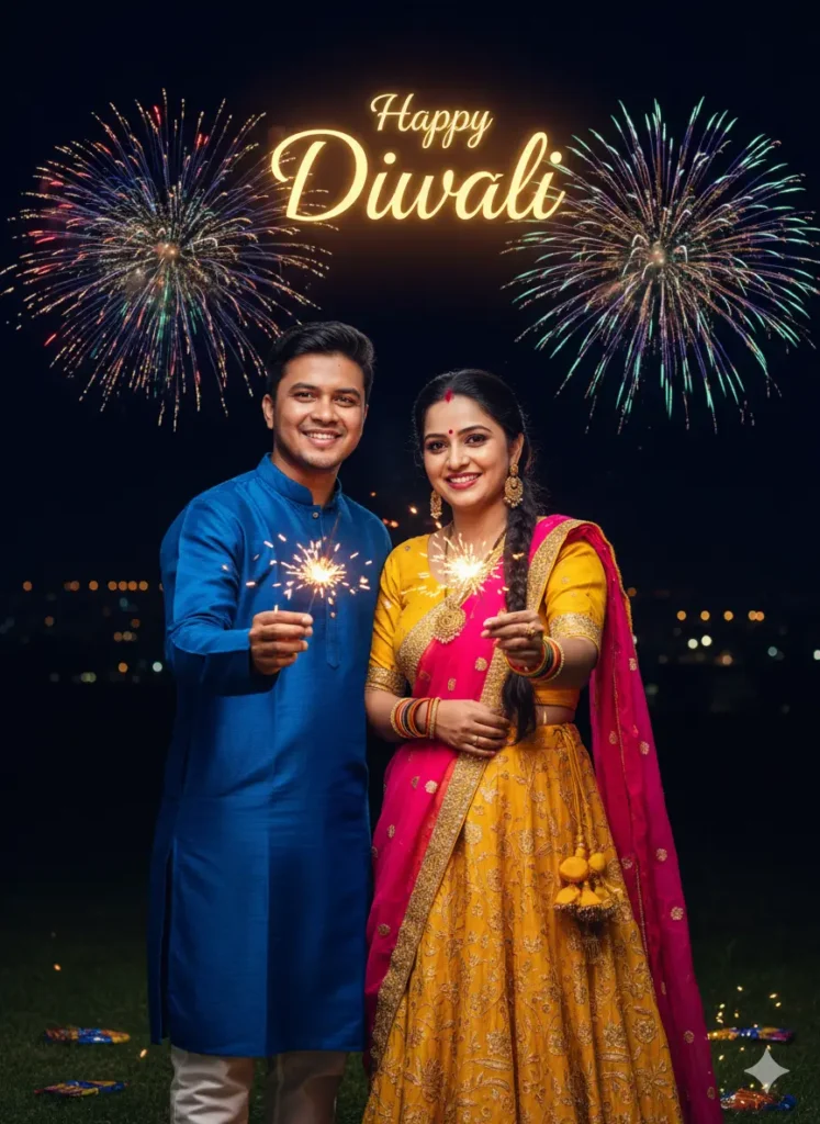 Create an ultra-realistic 8K cinematic portrait of a young Indian couple (same facial features from the reference images) in a medium shot, centered and framed from the waist up, looking directly at the viewer. The couple holds lit sparklers extended forward, casting warm, bright sparks that illuminate their faces and clothing. The male wears a royal blue kurta with long sleeves, a band collar, and white churidar pants, while the female wears a vibrant yellow lehenga choli with gold embroidery, a full skirt, and a bright pink dupatta with gold trim. She accessorizes with large gold jhumka earrings, colorful bangles, and her hair styled in a neat braid or partial updo. Both smile joyfully, slightly angled toward each other but facing forward.The background features a dark night sky with two large, colorful firework explosions (top left and top right) and faint blurred city lights, creating depth. The “Happy Diwali” text is positioned above their heads in elegant, flowing golden-yellow script, glowing like neon with a strong halo effect. A soft, overhead diffused light complements the sparkler glow, while the foreground shows subtle patches of grass with scattered unlit sparklers or small firecrackers.The scene is rendered with dynamic festive lighting, volumetric glow, shallow depth of field, smooth bokeh, and filmic color grading. Rich, vibrant tones of deep blues, radiant yellows, and fiery orange sparks create a warm, celebratory, and ultra-realistic Diwali atmosphere, perfect for a festive cinematic poster.