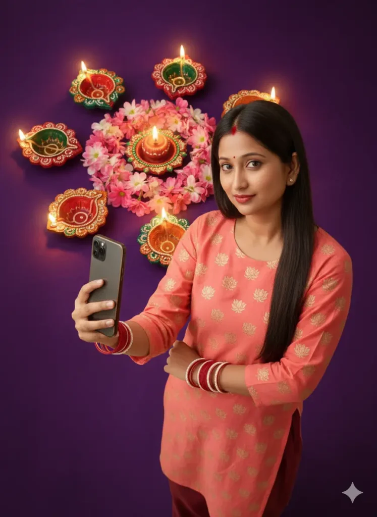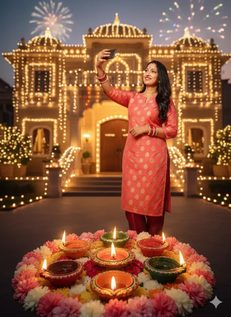 Create an ultra-realistic 8K HD cinematic image of a young Indian woman (same facial features and hairstyle from the reference) taking a selfie in front of a vibrant Diwali arrangement. The foreground features a top-down view of a circular cluster of bright red and white flowers with a single lit diya at the center, surrounded symmetrically by eight intricately decorated clay diyas in red, green, orange, and gold, all flickering warmly. Soft diffused light casts gentle shadows, giving the diyas and flowers subtle three-dimensional depth and a festive, traditional aesthetic.The woman stands slightly to the right, holding her smartphone with her right arm bent confidently. She wears a pink-orange blended kurta with tiny golden lotus motifs and silky deep maroon pajama pants. Her hands are adorned with red and white bangles, and she has a red bindi on her forehead. Warm ambient light from the diyas illuminates her face and attire, harmonizing with the glowing arrangement behind her.The background features the interior of a traditional Indian house with rich architectural details: wooden pillars, carved doors, and warm-toned walls. A beautifully decorated Laxmi temple is visible behind the woman, adorned with marigold garlands, small diyas, and fresh flowers. Additional lit diyas are placed on steps and shelves around the temple, and warm string lights hang subtly across the house, enhancing the festive ambiance. The overall background evokes an authentic Indian home during Diwali, full of devotion and celebration.The composition blends all elements seamlessly in one frame, with cinematic lighting, volumetric glow, shallow depth of field, smooth bokeh, and rich filmic color grading. The overall mood is joyful, festive, and spiritual, capturing both the traditional Diwali charm of the Laxmi temple and a contemporary celebratory selfie in ultra-realistic 8K detail.
