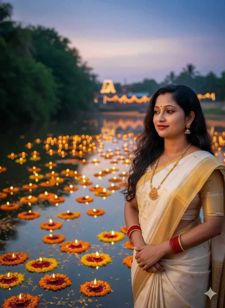 Create an ultra-realistic 8K HD cinematic portrait of a beautiful young Indian woman (same facial features and hairstyle as reference) standing gracefully by a calm river at dusk, surrounded by countless tiny, vibrant Pookalams floating on the shimmering water, each with a glowing diya at its center. She wears an elegant off-white Kerala kasavu sari with a golden border, gold jewelry, red bangles, and a red bindi, her wavy dark hair flowing naturally. Soft warm light from the diyas and the evening sky reflects on her face and attire, while lush greenery and a distant temple glow in the background, creating a serene, festive, and divine Diwali-inspired atmosphere with cinematic depth and filmic color grading.