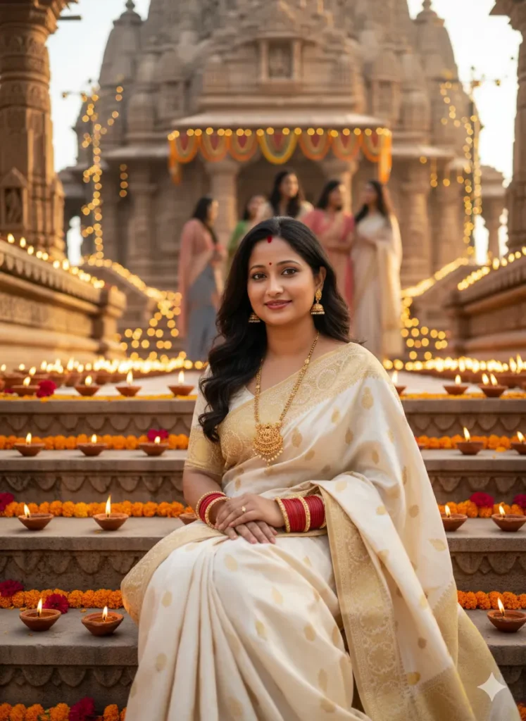 Create an ultra-realistic 8K HD cinematic image of a beautiful young Indian woman (same facial features and hairstyle as reference) seated gracefully on the front steps of a grand Gujarati temple, surrounded by the warm glow of countless lit diyas and vibrant flower decorations. She wears a traditional off-white and gold Gujarati-style saree with elegant jewelry, red bangles, and a red bindi, her wavy dark hair softly framing her serene face. Behind her, her friends sit on the upper temple steps, slightly blurred (5%) to keep the focus on her, adding depth and realism. The ancient temple glows with hanging lights, intricate carvings, and festive colors, while the soft golden evening light enhances the warm, devotional, and festive atmosphere with cinematic depth, volumetric glow, and rich 8K detail.