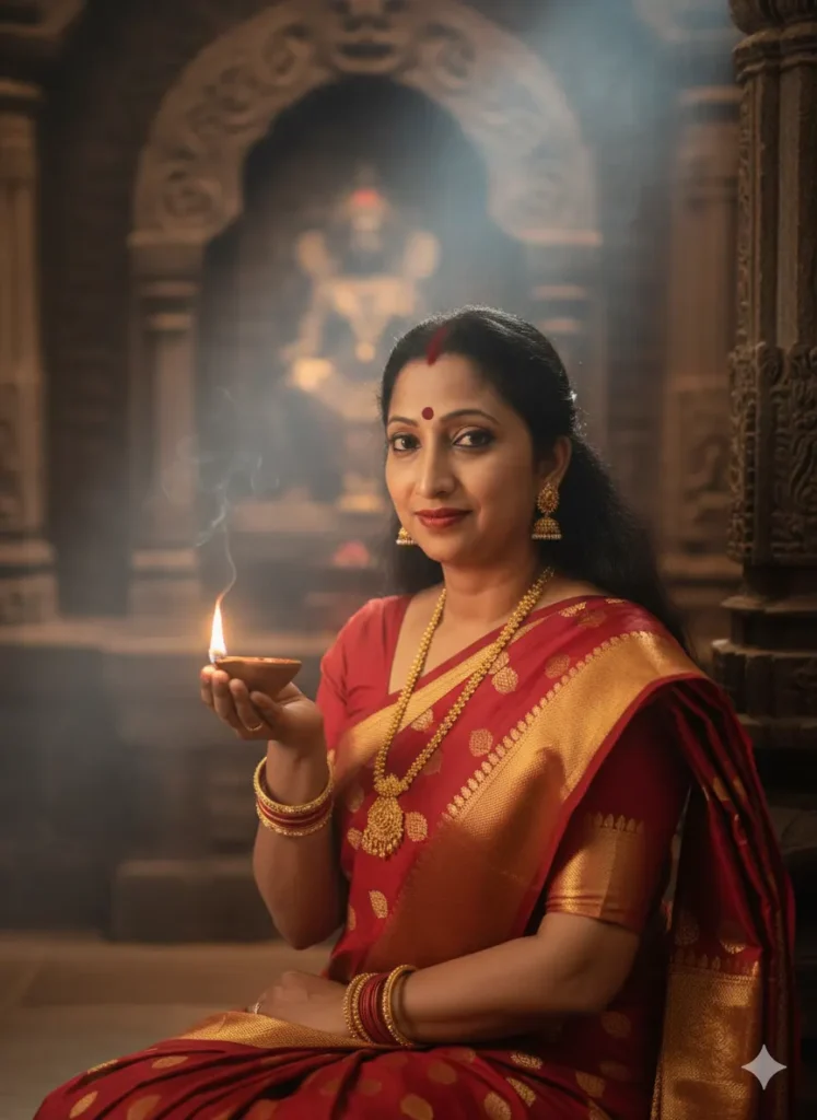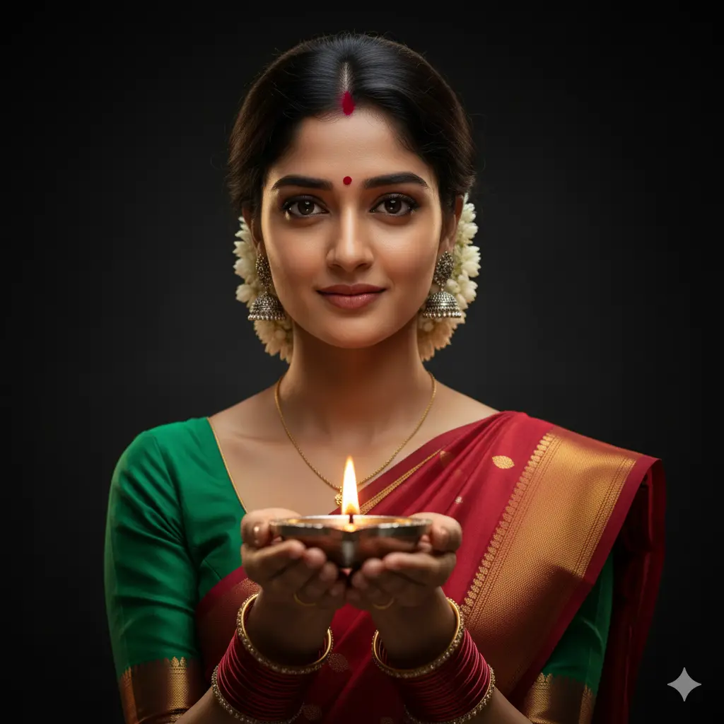 Create an ultra-realistic 8K cinematic close-up portrait of a traditional Indian woman (same facial features from the reference image), framed from the chest up, holding a lit brass or silver diya directly toward the viewer against a dark, minimalist background. The warm, soft light from the diya gently illuminates her face and hands, creating an intimate chiaroscuro effect with rich contrast between light and shadow. She wears a shiny red silk saree with a golden (color #9b3e26) border draped over her shoulder and an emerald green blouse, accessorized with silver jhumka earrings, add red bindi in forehead and red shiny bangles in both hands, a delicate gold chain with a small pendant, and a string of white jasmine flowers (gajra) adorning her neatly tied bun. Her expression is calm and graceful, with direct eye contact and a subtle, serene smile. Her eyes are crystal clear and black. The background is dark and unfocused, emphasizing the glowing lamp and her elegant presence. The image features cinematic lighting, volumetric glow, shallow depth of field, glossy finish, and filmic color grading in rich jewel tones of maroon, emerald, and gold for a luxurious, devotional, and captivating atmosphere.