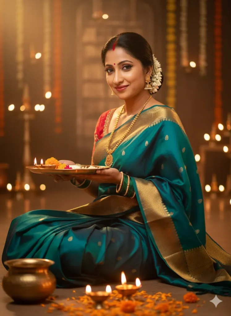 Ultra-realistic 8K cinematic portrait of a young Indian woman (keep facial reference from this image) seated cross-legged, looking directly at the viewer with a gentle, serene smile. She wears a traditional teal blue silk saree with a broad golden border and a red blouse with golden embroidery. Her hair is elegantly styled in a bun adorned with flowers. She wears gold jewelry: necklace, earrings, maang tikka, and green bangles. She holds a round brass plate with small offerings, including a lit lamp. Two glowing brass diyas with marigold petals and a brass bowl are in the foreground. The background features soft, warm bokeh, glowing lamps, and blurred classical Indian decorative elements. Lighting is warm, soft, and diffused, creating a halo effect, gentle illumination on her face, and a devotional, festive indoor atmosphere. Rich jewel tones and cinematic warmth.