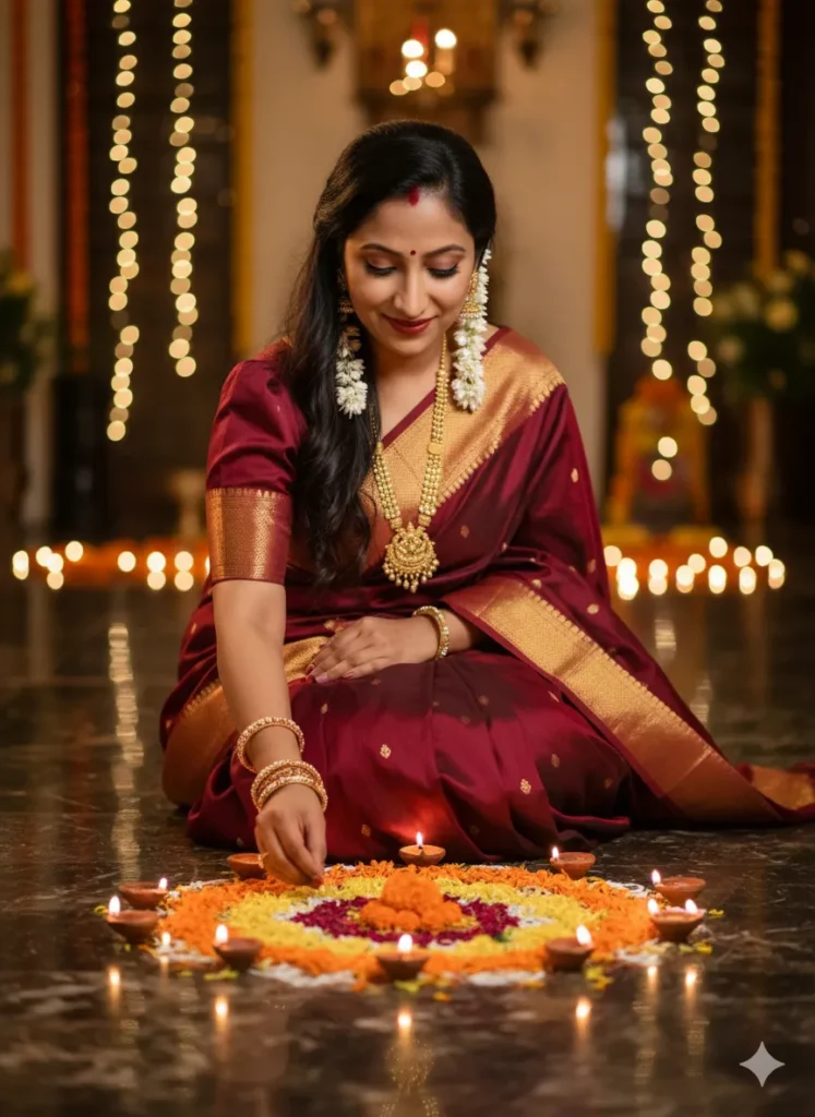 Recreate a ultra-realistic 8K cinematic portrait of a young beautiful Indian girl (keep facial reference from this image) seated on a polished floor, arranging lit clay diyas and marigold petals into a traditional rangoli. She wears a deep maroon silk saree with intricate golden embroidery, puffed-sleeve blouse, and elaborate gold jewelry (multi-layered necklace, earrings, bangles). Her dark hair is styled in soft waves with subtle floral accents, and she has a bindi and gentle makeup. The camera angle is slightly elevated, capturing her focused, serene expression and elegant posture. Soft warm ambient light and glowing diyas illuminate her face, hair, and jewelry. Background softly blurred with golden bokeh, hanging string lights, and hints of traditional Indian décor, creating a festive, luxurious, and devotional atmosphere.