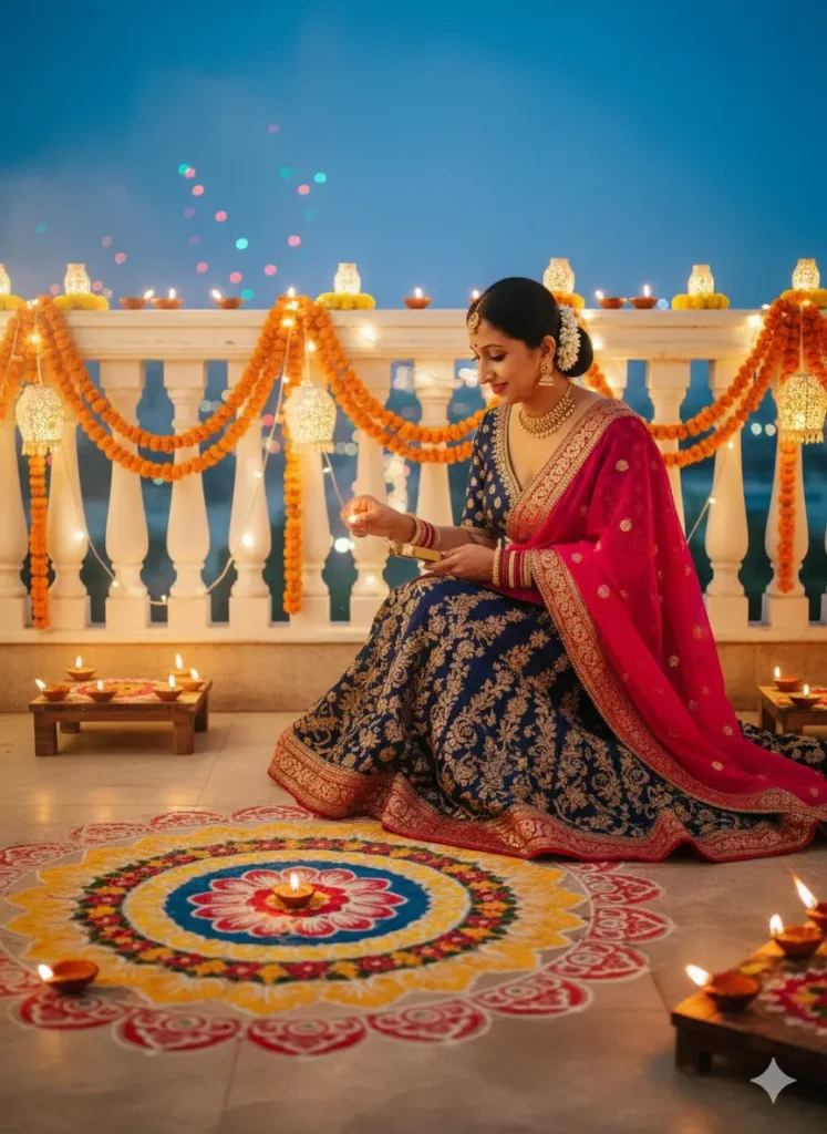 Create an ultra-realistic 8K cinematic portrait of a traditional Indian woman (same facial features from the reference image) in a medium-full shot, kneeling or squatting to the right of the frame as she lights a diya on a beautifully decorated outdoor balcony. The scene glows with warm, soft light from numerous diyas and string lights, with a large, colorful rangoli in the foreground and a dusky blue sky filled with blurred festive lights in the background. She wears a stunning navy blue lehenga choli richly embroidered with golden patterns, a deep V-neck blouse, and a voluminous skirt bordered in red and gold, paired with a fuchsia pink dupatta with golden trim. Adorned with traditional jewelry—gold earrings, necklace, bangles, and a maang tikka—her hair is styled in a neat bun decorated with flowers. The white balustrade behind her is draped with marigold garlands, LED lights, and hanging paper lanterns, while distant city lights shimmer softly. Her gentle, focused smile and graceful pose capture a serene and festive Diwali moment, rendered with cinematic lighting, volumetric glow, shallow depth of field, and rich filmic color grading for a warm, enchanting atmosphere.