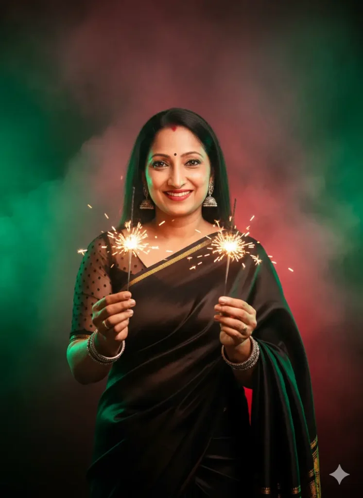 Create an ultra-realistic 8K cinematic portrait of a beautiful Indian woman (same facial features from the reference image) dressed in an elegant black saree with a thin golden border, holding two lit sparklers (phuljhadi) in her hands. She smiles brightly, looking directly at the camera with a confident and joyful expression. Her blouse features sheer, dotted fabric on the shoulders and neckline, adding a touch of sophistication. She accessorizes with traditional silver jhumka earrings and matching bangles that catch the warm glow of the sparklers. The background is a vibrant, moody blend of deep red and green mist or smoke, softly diffused to create a dramatic, festive atmosphere. The lighting is warm and cinematic, with soft highlights from the sparklers illuminating her face and attire. The image features ultra-realistic detail, filmic color grading, volumetric light, shallow depth of field, and smooth bokeh for a striking, elegant, and celebratory Diwali aesthetic.