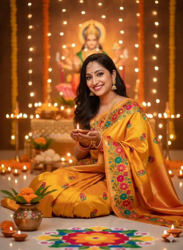 Create an ultra-realistic 8K cinematic portrait of a young Indian woman (same facial features from the reference image) in a medium-full shot, seated gracefully on the floor slightly to the right, holding a lit diya in her cupped hands. She wears a bright golden-yellow silk saree with intricate floral embroidery in pink, green, and blue, paired with a matching blouse, and is adorned with traditional gold jewelry—necklace, earrings, and bangles. Her dark hair falls in soft waves over her shoulders, with a subtle maang tikka and a small black bindi on her forehead. The background features a festive altar with a deity idol, bowls of sweets, countless lit diyas, and vertical strings of warm fairy lights creating a sparkling curtain effect. In the foreground, a colorful circular rangoli and additional diyas add depth, along with a small bronze pot decorated with marigolds and mango leaves. Warm, soft light from the diyas and string lights illuminates her face, hair, and attire, creating a radiant, festive glow. She smiles brightly, looking directly at the viewer, exuding joy, devotion, and celebration. The image features cinematic lighting, volumetric glow, shallow depth of field, glossy finish, smooth bokeh, rich warm color grading, and a traditional Diwali aesthetic.