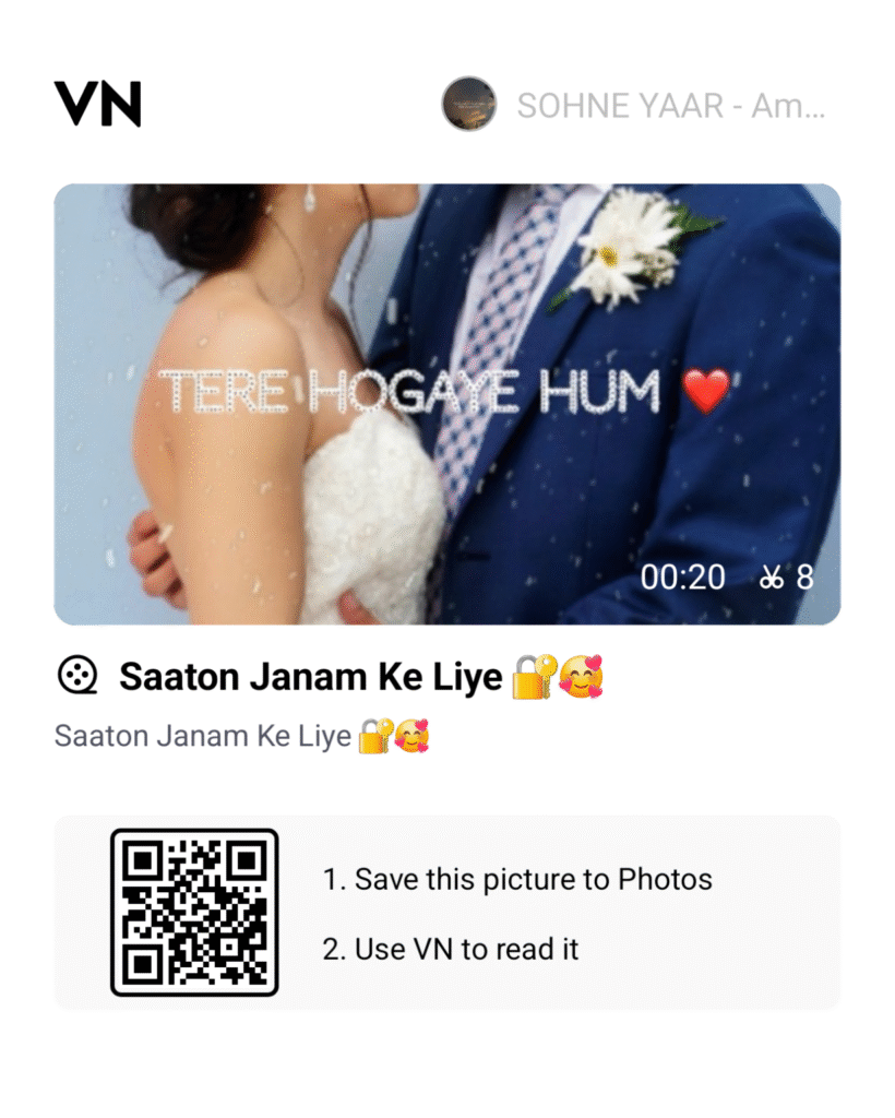 The wedding Wedding VN Template (QR Code) is a great template to make wedding videos. These templates come with luxurious effects, smooth transitions and music options, making a highlight reel or short clip for social media. Video can be made without learning from this template.